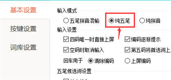 进入设置之后,我们在左侧找到基本设置功能,然后哦我们在输入模式中找到纯五笔选项。
