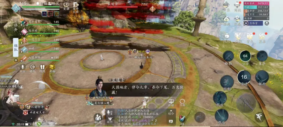 60%和20%血量左右,裴道士积蓄天地之力对全场进行攻击,各位少侠需要在40秒内绘制完成符咒才能将其中断,使BOSS进入虚弱状态。